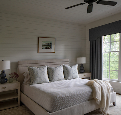 Nevertheless, there is nothing spartan about the space. The large game room, with its well-appointed bar, custom air-hockey table and foosball pitch, invites raucous contests, offering plenty of space for family to join. The sweet bunkroom evokes thoughts of bedtime stories and smiling goodnight kisses. It is dreamy. In all the bedrooms, Katie opted to lighten the walls with a creamy white shiplap. She also reduced the visual weight of the furnishings by selecting finer lines for the bedframes. This subtle shift communicates a calm airiness: it promises a good night’s sleep.