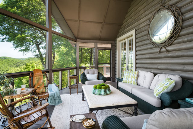 Outside, the porch serves as an extension of the interior living spaces. Here, a mix of wicker furniture and classic Appalachian rocking chairs offers a cozy and inviting space to enjoy the breathtaking views of the Blue Ridge Mountains. Accessories in soft, natural tones add layers of comfort and charm, making this outdoor area a favorite spot for both slow Sunday mornings and sweet summer evenings with friends and family.