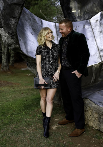 On Her: SAND Tweed Sequin Dress, $750; Liviana Conti Leather Square Toe Boot, $450; Adele Leather Clutch, $295; Roberto Coin 18K White Gold Cross Necklace-Diamond 2.78 TCW; Roberto Coin 18k Yellow Gold Diamond Bangle- 3.25 TCW; Roberto Coin 18K Yellow Gold, White Enamel with Diamonds 0.10 TCW.