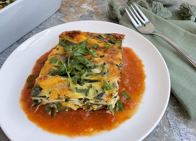 Allow the casserole to rest for 10 minutes before slicing into portions and topping with sauce. Garnish with cilantro and green onion tops and serve.