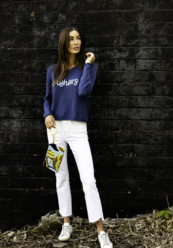 Cashiers sweater, $98; Leslie Curtis earrings, $46; Dear John white denim pants, $120; Glenda Gies handbag, $99; all at A Jones Company.