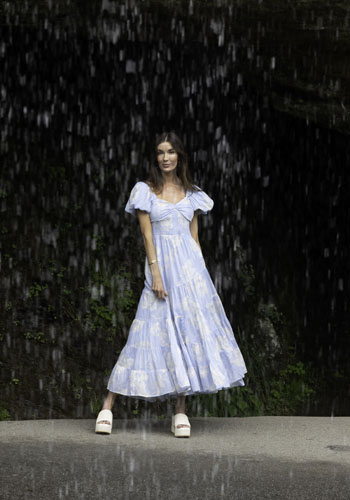 Free People floral tiered maxi dress in “Sky Combo,” $168; Beach by Matisse shoes, $59; Sahira earrings, $46; Sahira bracelet, $59; all at Annawear.