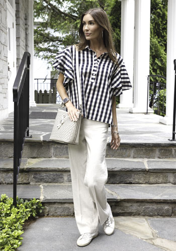 Lior “Stella” linen pant, $139; Lior “Harmony” top, $129; Brighton watch band, $110; Brighton bracelet, $88; Brighton earrings, $72; Brighton “Diamante” handbag, $355; all at The Look Boutique.