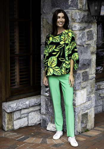 Joseph Ribkoff pant in “Island Green,” $205; Joseph Ribkoff top in black/multi, $195; all at Spoiled Rotten.
