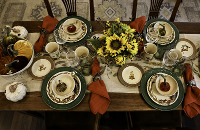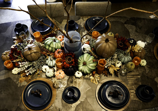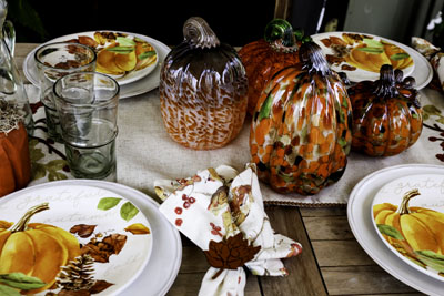 “When setting my table, I like to incorporate traditional fall colors in the fabrics and dinnerware,” says Store Manager Marian Duncan. “The pumpkins are fun as the final touch, whether real or glass, with each one having its own distinct identity. Don't be afraid to mix things up because it's all about using your imagination to create your special work of art.”
