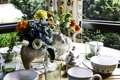 Liz suggests a jumble of pumpkins on a kitchen island, dining table or fireplace mantle and included a spooky twig centerpiece in her tablescape. “And don’t be afraid to make bold design choices. More is more during this time of year,” says Liz. “Layers, colors and textures will make your home interesting and unique. Attention to lamps and lighting will help enhance your space. It can change the color of your walls throughout the day.”on the plateau, their joyful flourish embodies the friendly climate of summer and fall in the mountains.