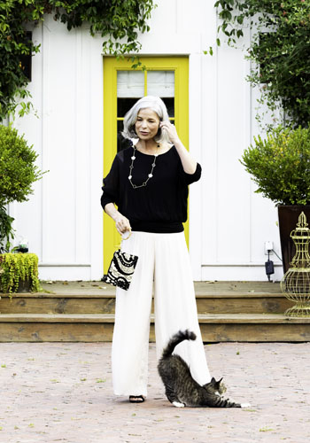 Cobblestone Living Top, $89; Cobblestone Living Pants, $89; Necklace, $89; Glenda Gies Handbag, $99. All at A Jones Company, Cashiers.