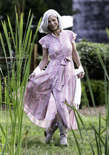 Large Pashmina Scarf, Ivory, $32; Oliphant Ruffle Collar Maxi Dress in Sonoma Orange, $328; Earrings, Bracelet & Necklace, various prices. All at Gracewear, Cashiers.