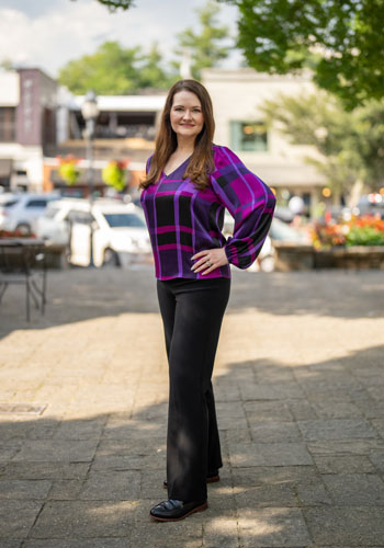 Joseph Ribkoff purple plaid top, $235; Joseph Ribkoff wide leg pants in black, $175. At Spoiled Rotten, Highlands. Model: Amanda Mulkey