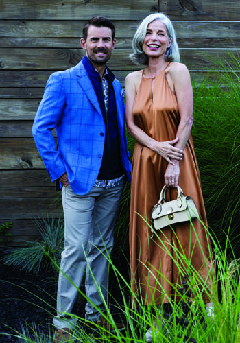 On Her: Long Silk Dress in Copper by Beryll, $525; Popa Suede Wedge Sandal, $278; Keyhole Mini Leather Purse; $550. All at TJ Bailey’s, Cashiers and Highlands. On Him: Blue Flower Print Beige Cotton Shirt; $245; Travel Vest with Knit Sides, $875; New Light Plaid Virgin Wool Silk Linen Sportscoat, $2,695; Bonn Organic Cotton Micro Print Trouser, $315; Bermuda Braid Nubuck Leather Loafer. All at TJ Bailey’s.