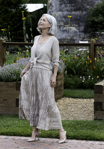 Nic & Zoe Sweater Set with Camisole, $149; Nic & Zoe Crinkle Skirt, $188. At Wit’s End, Highlands.