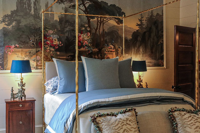 Kathy Patton designed the owner’s suite on the second floor, utilizing the high ceilings and natural light from dormer windows to create an inviting retreat. Kathy states, “This room is asymmetrical, which provides challenges, but the outcome was beautiful thanks to our wonderful partners at Zuber & Cie.” She told us, “I have always appreciated the exquisite artistry found in Zuber & Cie panels from France and designed the entire space around the Eldorado scene from their catalog.”
