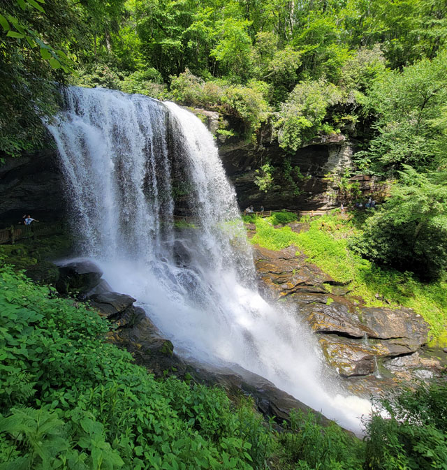 The first waterfall of the drive may be the most impressive, though one of the more difficult ones to visit as the pull-out is barely wide enough for a couple of cars, and the views are often restricted by foliage in the summer. Cullasaja Falls, the largest of the waterfalls in the gorge, earned its name from an indigenous word meaning “place of the honey locust,” though a few sources note the sweetgum trees that you also find nearby. Massive pines, hemlocks, sassafras, maples, oak, and even a few chestnut saplings are common sightings along the way. The variety makes for an extremely colorful drive in the fall as the leaves change. Local photographers, such as the Renfro family, have managed to capture this waterfall’s beauty.